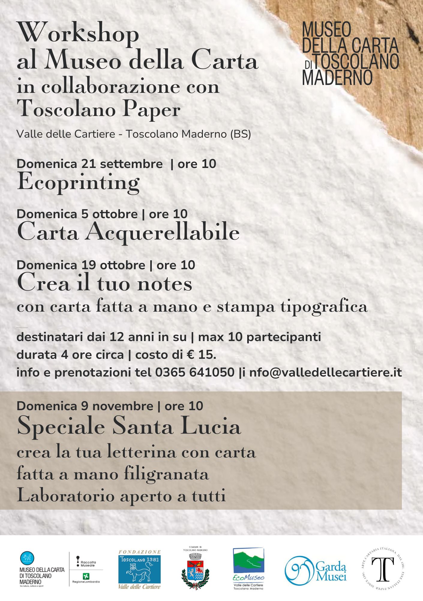 Domenica 21 settebre | ore 10 Ecoprinting Domenica 5 ottobre | ore 10 Carta Acquarellabile Domenica 19 ottobre | ore 10 Crea il tuo notes Destinatari dai 12 anni in su | max 10 partecipanti durata 4 ore circa | costo 15 € info e prenotazioni tel 0365641050 | info@valledellecartiere.it